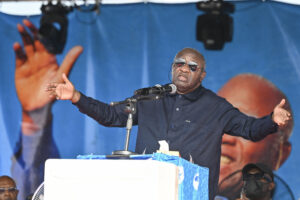 Former Ivorian president Laurent Gbagbo addresses his supporters gathering for the celebrations of the 2nd "Renaissance Festival" in Agboville on April 6, 2024. (Photo by Issouf SANOGO / AFP)