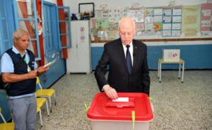 Tunisia's President Kais Saied casts his ballot at a polling station, during a referendum on a new constitution, in Tunis, Tunisia July 25, 2022. Tunisian Presidency/Handout via REUTERS ATTENTION EDITORS - THIS IMAGE WAS PROVIDED BY A THIRD PARTY NO RESALES. NO ARCHIVES.